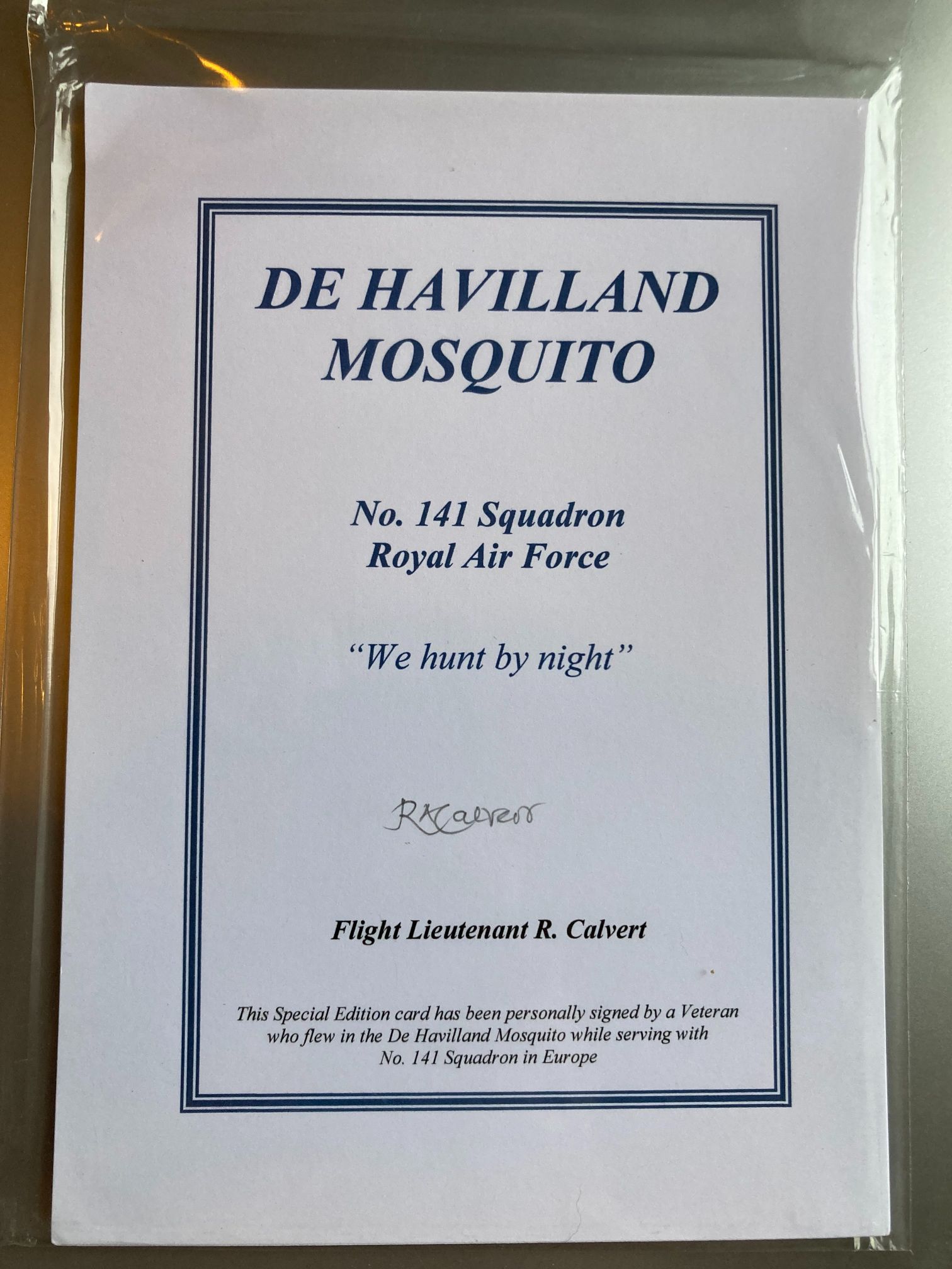 This item is a modern special edition commemorative card honouring the De Havilland Mosquito aircraft and the operational history of No. 141 Squadron, Royal Air Force. The card is hand-signed in ink by Flight Lieutenant R. Calvert, a veteran who flew the Mosquito with the squadron during its service in Europe. No. 141 Squadron was a distinguished unit that specialised in night fighter and intruder missions, reflected by the motto We hunt by night printed on the card. This type of ephemera was typically produced in limited quantities for military collectors and veterans’ organisations during the late 20th or early 21st century. The card features a double-border design and includes the following text: DE HAVILLAND MOSQUITO, No. 141 Squadron Royal Air Force, We hunt by night, Flight Lieutenant R. Calvert, and a descriptive footer regarding the veteran’s service. Dimensions: Approx. 148mm x 210mm.