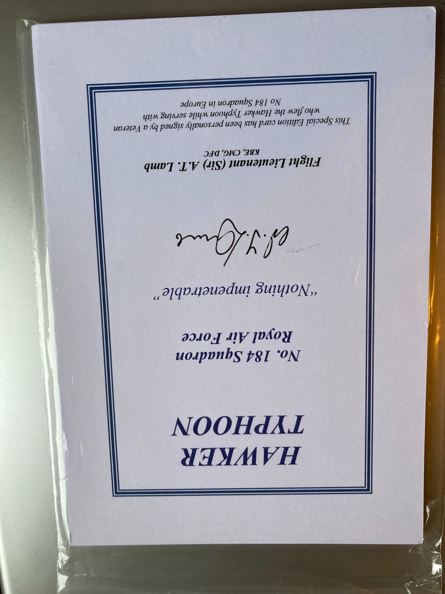 This lot comprises a special edition commemorative card personally signed by Flight Lieutenant (Sir) Archibald Thomas Archie Lamb, KBE, CMG, DFC. The card honours the service of the Hawker Typhoon aircraft and the personnel of No. 184 Squadron, Royal Air Force, during the Second World War in Europe. The printed text includes the squadron motto Nothing impenetrable and confirms the signatory as a veteran who flew the Typhoon while serving in the European theatre. Archie Lamb (1921–2010) was a distinguished pilot who earned the Distinguished Flying Cross (DFC) for his actions with No. 184 Squadron, which specialised in hazardous ground-attack missions over Northwest Europe following the D-Day landings. Following his military service, Lamb enjoyed a prominent career in the Diplomatic Service, eventually serving as the British Ambassador to Kuwait and Norway and receiving a knighthood (KBE).