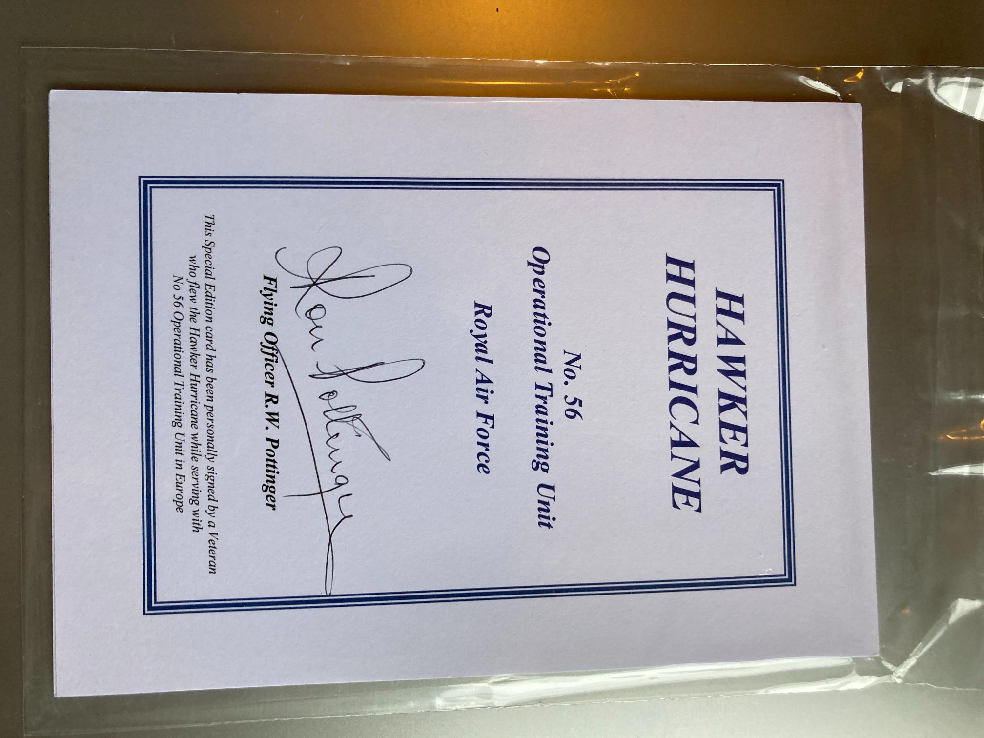 This is a professional commemorative card issued to honour the legacy of the Hawker Hurricane and the pilots of the Royal Air Force during the Second World War. The card is specifically associated with No. 56 Operational Training Unit (OTU), a unit based in the United Kingdom tasked with the conversion of pilots to fighter aircraft before their posting to frontline squadrons. The centrepiece of this item is the original hand-signature of Flying Officer R.W. Pottinger, executed in black ink. The printed text at the base confirms the authenticity of the signature, noting Pottinger’s service as a Hurricane pilot within the European theatre. The card features clean blue printing on a white cardstock base with a traditional double-line border. This item serves as a significant piece of RAF memorabilia, linking modern collectors to the historical service of the No. 56 OTU. Dimensions: 150mm x 105mm.