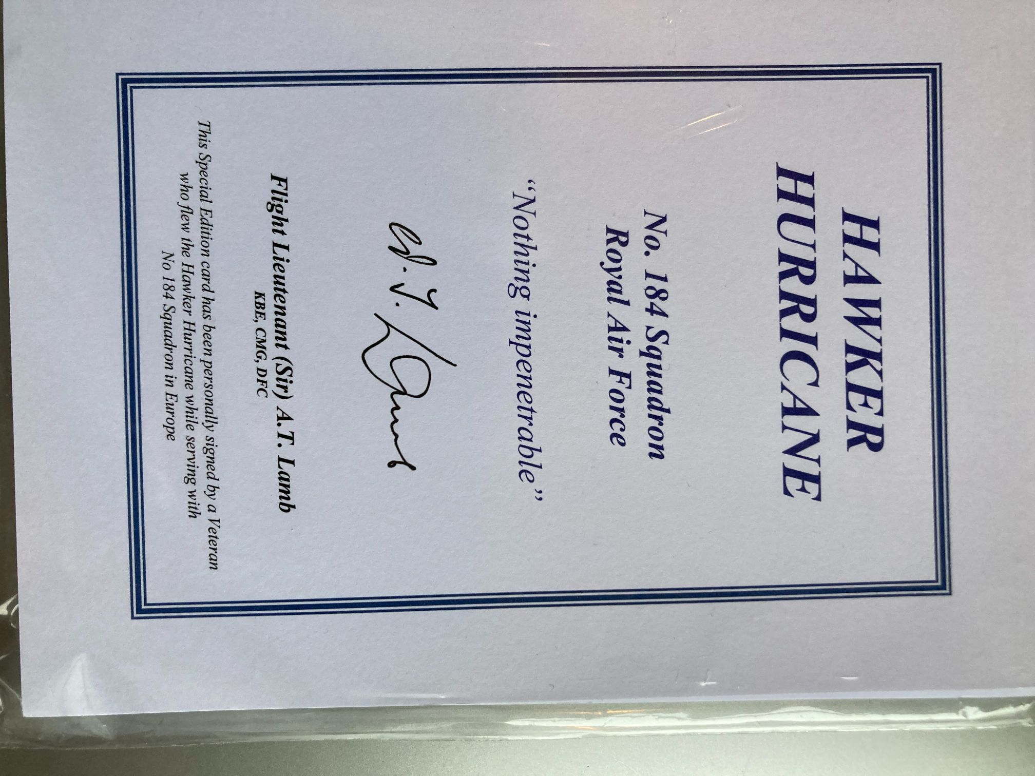 This is a “Special Edition” commemorative aviation card dedicated to the Hawker Hurricane and No. 184 Squadron of the Royal Air Force. The card features the squadron motto, “Nothing impenetrable,” and is personally hand-signed in black ink by Flight Lieutenant (later Sir) Albert Thomas Lamb, KBE, CMG, DFC (1921–2019). Sir Albert was a distinguished pilot during the Second World War, flying ground-attack sorties in both Hawker Hurricanes and Typhoons over North-West Europe. He was awarded the Distinguished Flying Cross (DFC) in 1945 for his gallantry and devotion to duty. Following his military service, he transitioned to a highly successful career within the Foreign and Commonwealth Office, eventually serving as the British Ambassador to Kuwait and Norway. This item represents a significant piece of RAF ephemera, linking a specific combat unit to a decorated veteran and notable British diplomat.