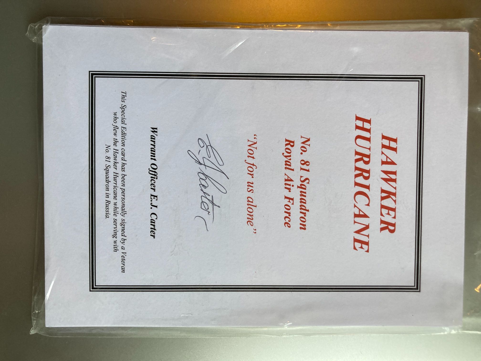 A commemorative special edition card dedicated to the Hawker Hurricane and the Second World War service of No. 81 Squadron, Royal Air Force. The card is hand-signed in black ink by Warrant Officer Eric J. Carter, a veteran pilot who flew Hurricanes with the squadron during the Russian campaign. In late 1941, No. 81 Squadron, as part of No. 151 Wing, was deployed to Murmansk under ‘Operation Benedict’. Their mission was to provide essential air cover for the Arctic convoys and to train Soviet pilots and ground crew on the Hawker Hurricane. The card features printed text in red and black, including the squadron’s motto, “Not for us alone,” and a specific dedication to the veterans who served in Russia. This is a significant piece of ephemera relating to a unique and often overlooked chapter of RAF history on the Eastern Front.
