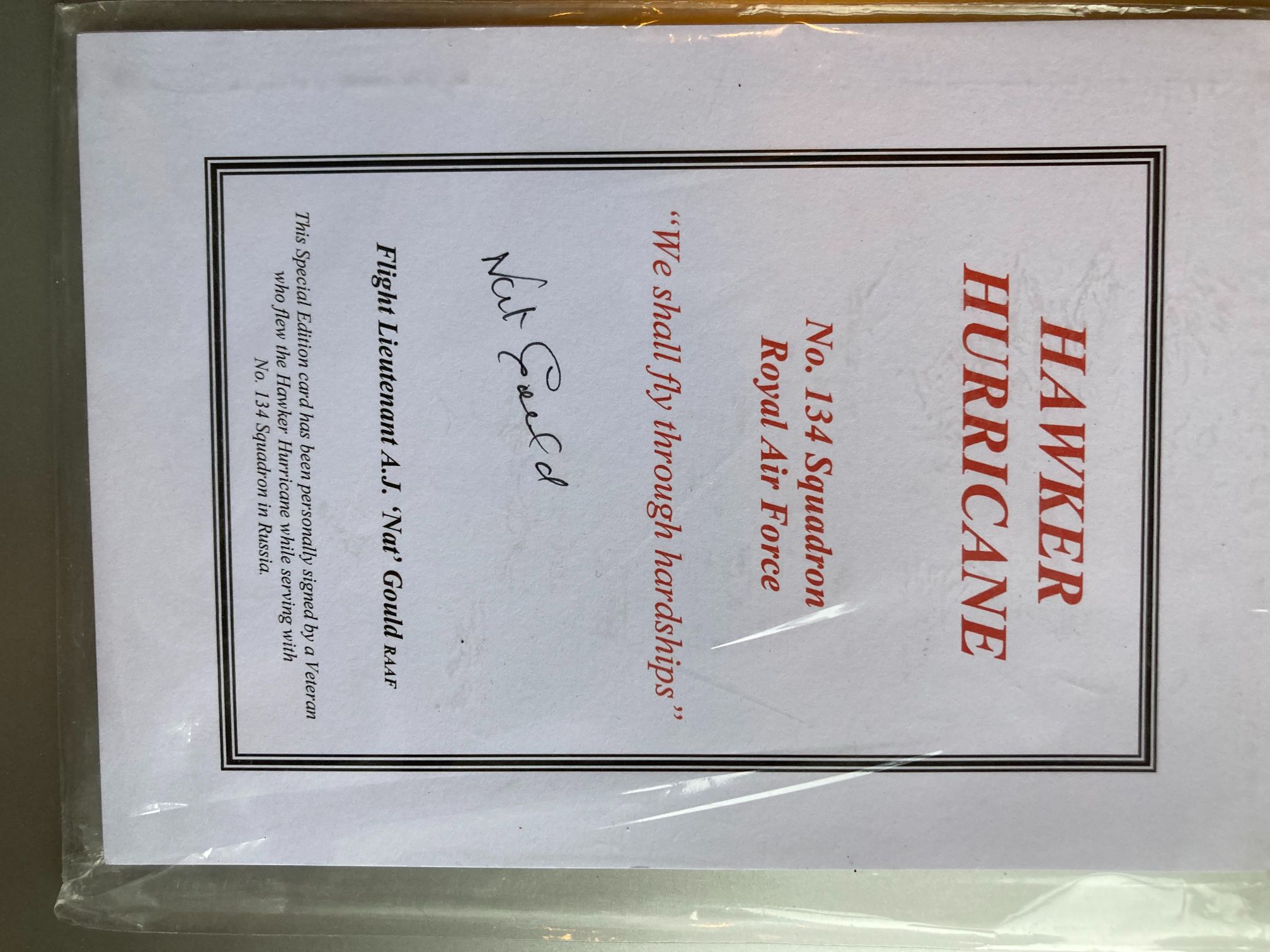 This is a signed commemorative special edition card featuring the Hawker Hurricane aircraft and No. 134 Squadron of the Royal Air Force. Produced in the late 20th or early 21st century, the card serves as a tribute to the squadron’s operations in Russia during the Second World War. As part of No. 151 Wing, No. 134 Squadron was deployed to the Murmansk region in late 1941 to provide air defence and instruct Soviet pilots on the Hurricane as part of Operation Benedict. The card is hand-signed in black ink by Flight Lieutenant A.J. Nat Gould, an Australian pilot serving with the RAAF who flew with the squadron during this Eastern Front campaign. The text includes the squadron motto, We shall fly through hardships, and a brief explanatory note regarding the veteran’s service. Transcription: HAWKER HURRICANE; No. 134 Squadron Royal Air Force; We shall fly through hardships; This Special Edition card has been personally signed by a Veteran who flew the Hawker Hurricane while serving with No. 134 Squadron in Russia; Flight Lieutenant A.J. Nat Gould RAAF.