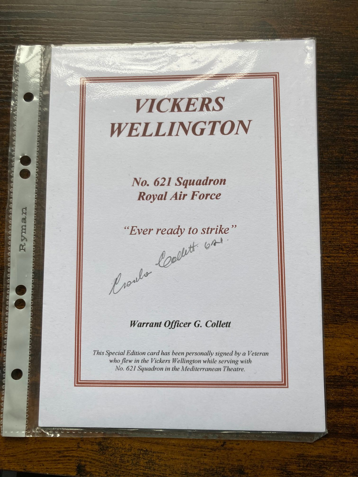 This item is a modern special edition commemorative card honouring the Vickers Wellington aircraft and the service of No. 621 Squadron, Royal Air Force. Produced circa the late 20th to early 21st century, the card features the squadron motto, Ever ready to strike, and provides historical context regarding service in the Mediterranean Theatre. The card is hand-signed in black ink by veteran Warrant Officer G. Collett, who has inscribed his squadron number 621 next to his name. No. 621 Squadron operated the Wellington in maritime roles, specifically anti-submarine patrols across the Mediterranean during the Second World War. The card is uncredited to a specific printer or publisher. Transcribed text: VICKERS WELLINGTON, No. 621 Squadron, Royal Air Force, Ever ready to strike, Warrant Officer G. Collett. A lower caption states: This Special Edition card has been personally signed by a Veteran who flew in the Vickers Wellington while serving with No. 621 Squadron in the Mediterranean Theatre. Dimensions: 148mm x 210mm.