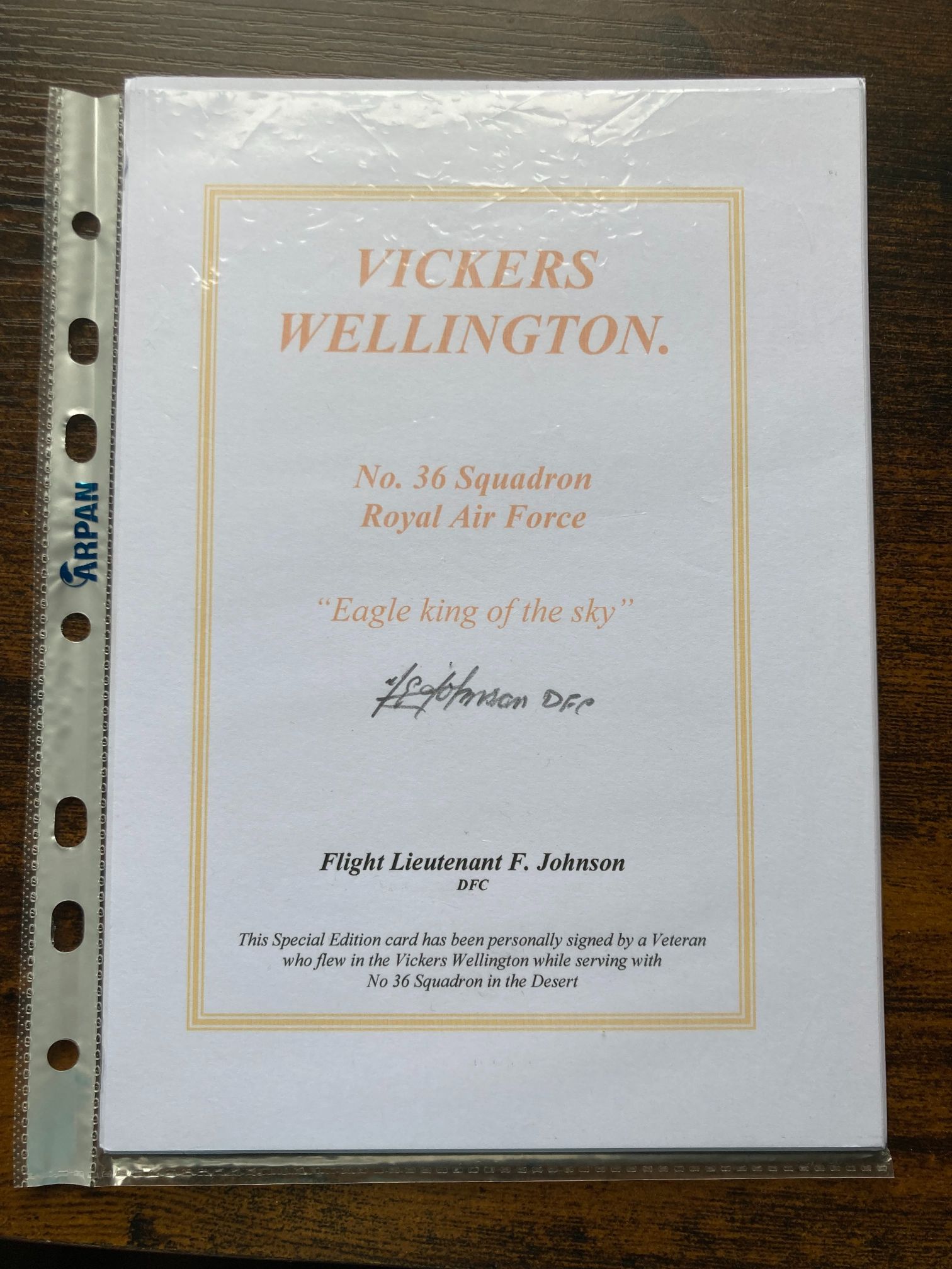 This is a modern commemorative Special Edition aviation card, likely produced in the late 20th or early 21st century as part of a series honouring Second World War veterans. The card features a printed orange decorative border and commemorates the Vickers Wellington aircraft and the service of Flight Lieutenant F. Johnson, DFC. It is personally autographed in black ink by Flt Lt Johnson. The text reads: VICKERS WELLINGTON. No. 36 Squadron Royal Air Force Eagle king of the sky Flight Lieutenant F. Johnson DFC. A lower caption states: This Special Edition card has been personally signed by a Veteran who flew in the Vickers Wellington while serving with No 36 Squadron in the Desert. No. 36 Squadron was a notable unit that operated Wellingtons in the Middle East and Mediterranean theatres during the conflict, performing anti-submarine and bombing missions. This item serves as a significant piece of military history, linking the iconic geodetic bomber with a decorated pilot.