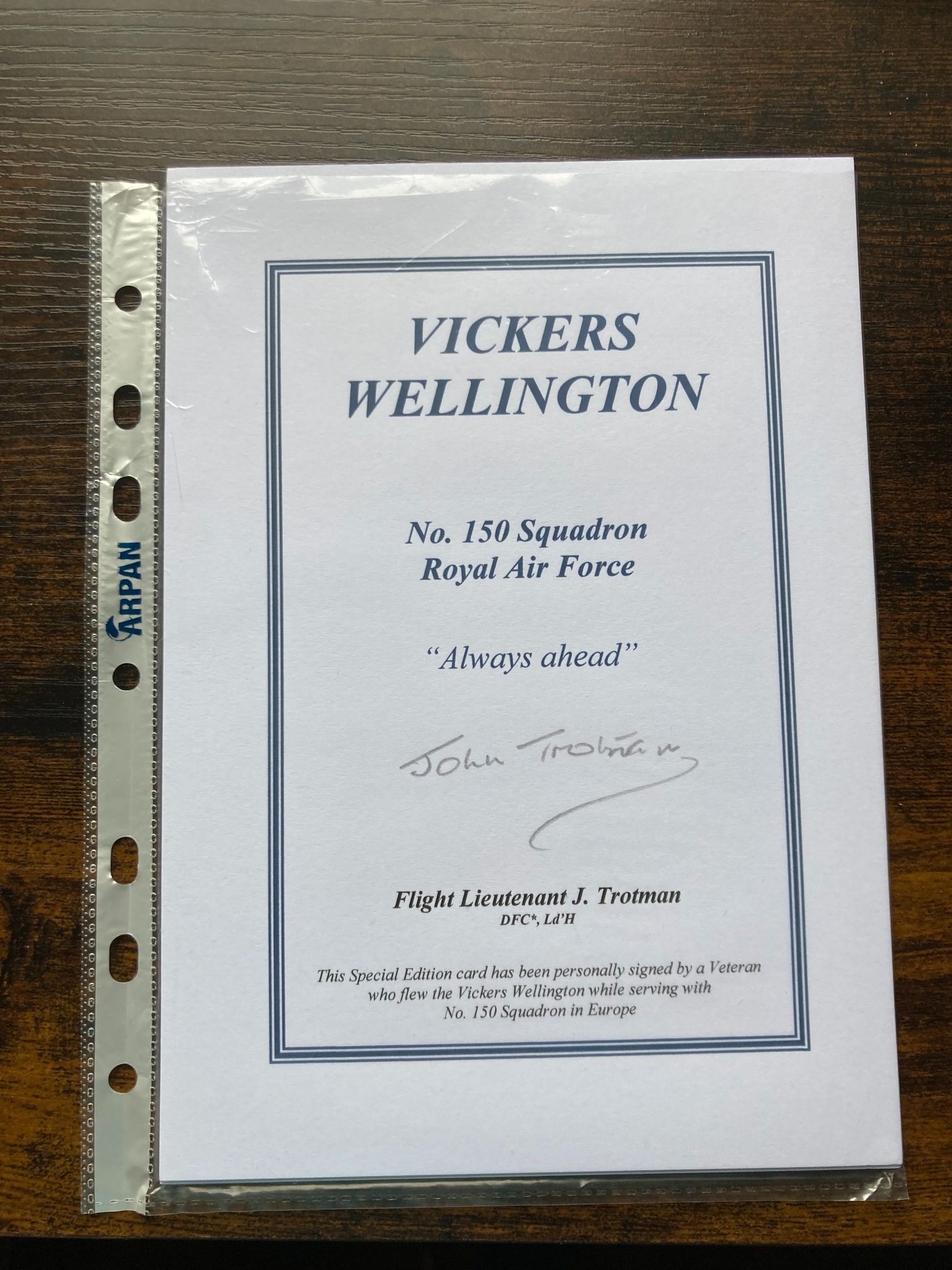 A Special Edition commemorative aviation card dedicated to the Vickers Wellington bomber, personally signed by Flight Lieutenant John Trotman, DFC* (and Bar), Ld’H. Trotman was a highly distinguished Royal Air Force bomber pilot who served with No. 150 Squadron during the Second World War. The card features the squadron’s motto Always ahead and identifies Trotman’s rank and decorations. The Distinguished Flying Cross with Bar indicates two separate awards for gallantry in flying operations against the enemy. Trotman completed two full operational tours, a remarkable feat given the attrition rates in Bomber Command, flying both the Wellington and the de Havilland Mosquito. The inclusion of the Ld’H signifies his appointment to the French Légion d’Honneur for his role in the liberation of France. This item represents a significant piece of British military aviation history, commemorating a decorated veteran of No. 1 Group, Bomber Command.